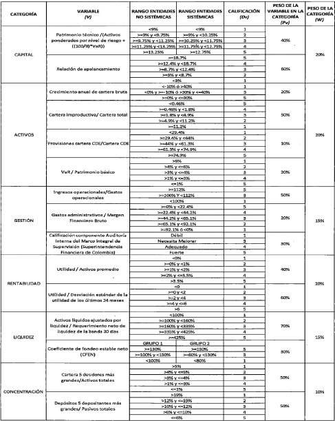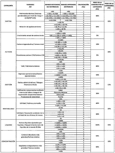 La calificación trimestralde cada entidad está determinada por el promedio trimestral de ña calificación mensual. La califixaion mensual corresponde a las suma ponderada de todas las categorías que componen la calificación menos el indicadior de entodades con importancia sistémica piblicado por la Superintendencia Financiera de Colombia.