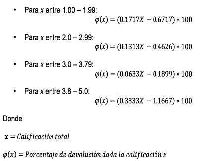2. El porcentaje de devolución que se aplicará al valor total de las primas pagadas, durante el trimestre evaluado, se calculará aplicando la siguiente fórmula, según corresponda, a la calificación trimestral obtenida por la entidad: