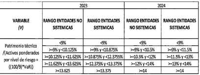 Atendiendo el tiempo de transición para la implementación completa de los requerimientos de capital de Basilea III, para los años 2023 y 2024 los rangos para la variable de solvencia total serán: