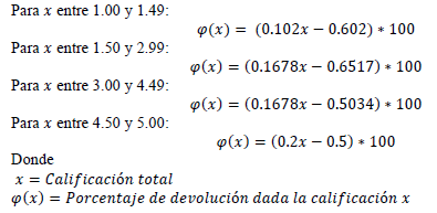 2. El porcentaje de devolución que se aplicará al valor total de las primas pagadas, durante el trimestre evaluado, se calculará aplicando la siguiente fórmula, según corresponda, a la calificación trimestral obtenida por la entidad: