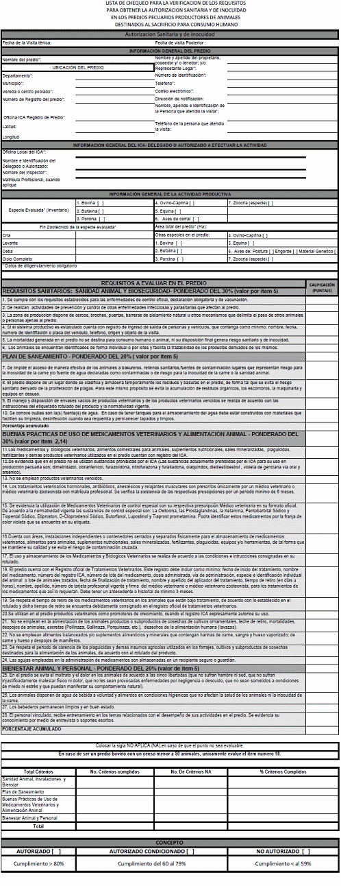 Durante la visita técnica de autorización se diligenciará una lista de chequeo compuesta por los componentes a evaluar, de acuerdo a lo establecido en el Anexo número 1 de la presente Resolución. En la lista de chequeo se reflejará la puntuación total del predio como resultado de la visita. El predio será autorizado si obtiene un nivel de cumplimiento de más del 80% de los requisitos. Valores de cumplimiento comprendidos entre el 60% y el 79% se consideran como concepto autorizado sujeto a la ejecución de un Plan de Cumplimiento concertado con el productor. Este Plan quedará consignado en la lista de chequeo. Un puntaje inferior al 60% de la calificación dará como resultado la no autorización del predio.