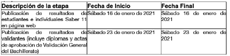 ARTÍCULO 1o. Modificación numeral 2 artículo 1o Resolución número 888 de 2019. Modifíquense las etapas “Publicación de resultados de estudiantes e individuales Saber 11 en página web” y “Publicación de resultados de validantes (incluye diplomas y actas de aprobación de Validación General del Bachillerato)”, contenidas en el numeral 2 del artículo 1o de la Resolución número 888 de 2019, numeral modificado por la Resolución número 467 de 2020, las cuales quedarán así: