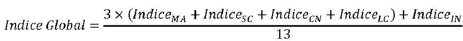 Posteriormente, se obtendrá un Índice Global realizando un promedio ponderado de los índices obtenidos en cada una de las pruebas, usando como ponderadores los señalados en el literal b) del artículo tercero de la presente resolución, es decir, el Índice Global se calculará de la siguiente manera: