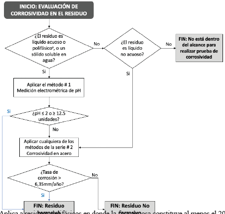 ARTÍCULO 13. DIAGRAMA DE DECISIÓN PARA EVALUACIÓN DE LA CORROSIVIDAD. Para evaluar la caracteristica de corrosión en un residuo, teniendo en cuenta los metodos referenciados en el Artículo 12 de la presente resolución, se efectuaran los analisis de acuerdo con el siguiente diagrama de decision, el cual indica el orden y la aplicabilidad de los ensayos de acuerdo con el tipo de residuo.