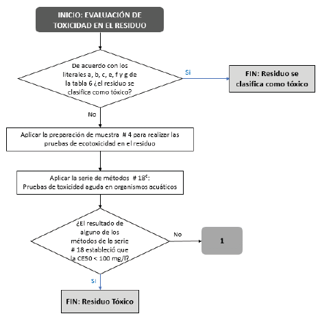 ARTÍCULO 31. DIAGRAMA DE DECISIÓN PARA EVALUACIÓN DE LA TOXICIDAD. Para evaluar la característica de toxicidad en un residuo, teniendo en cuenta los métodos referenciados en el artículo 30 de la presente Resolución, se efectuarán los análisis de acuerdo con el siguiente diagrama de decisión, el cual indica el orden y la aplicabilidad de los ensayos según el tipo de residuo.