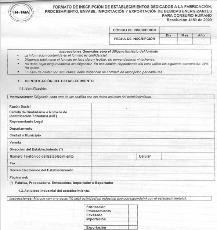 ARTÍCULO 1o. FORMATO ÚNICO PARA LA INSCRIPCIÓN. Adóptese de manera oficial, para efectos de la inscripción de todos los establecimientos dedicados a la fabricación, procesamiento, envase, importación y exportación de bebidas energizantes para consumo humano, el Formato Único de Inscripción.
