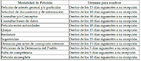 ARTÍCULO 5o. TÉRMINO DE LOS DERECHOS DE PETICIÓN. De acuerdo con lo establecido en los artículos 15 de la Ley 24 de 1992, 14 de la Ley 1755 de 2015 y demás normas especiales, cuando se trate de una solicitud con carácter de derecho de petición, se deberá tramitar en los términos máximos de la siguiente manera: