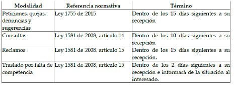 4. Término: Tiempo con el que cuenta la entidad para resolver los PQRSDF, según lo definan las normas que regulan la materia.