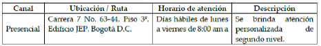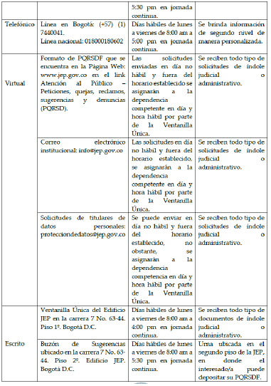 ARTÍCULO 23. CANALES Y HORARIOS DE ATENCIÓN. Los canales y horarios de atención establecidos por la JEP para la presentación de peticiones, quejas, reclamos, sugerencias, denuncias y felicitaciones son:
