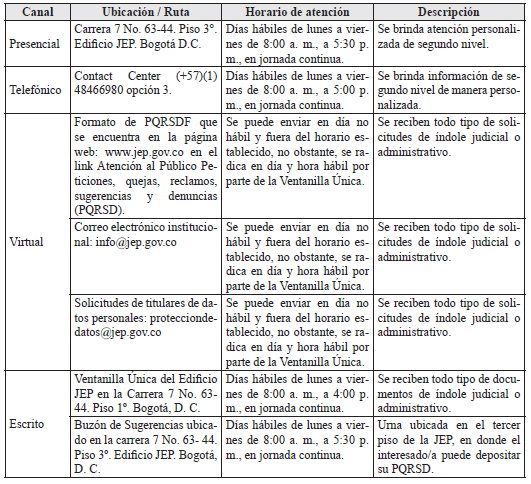 ARTÍCULO 23. CANALES Y HORARIOS DE ATENCIÓN. <Resolución derogada por el artículo 42 de la Resolución 602 de 2020> Los canales y horarios de atención establecidos por la JEP así como para la presentación de peticiones, quejas, reclamos, sugerencias, denuncias y felicitaciones son: