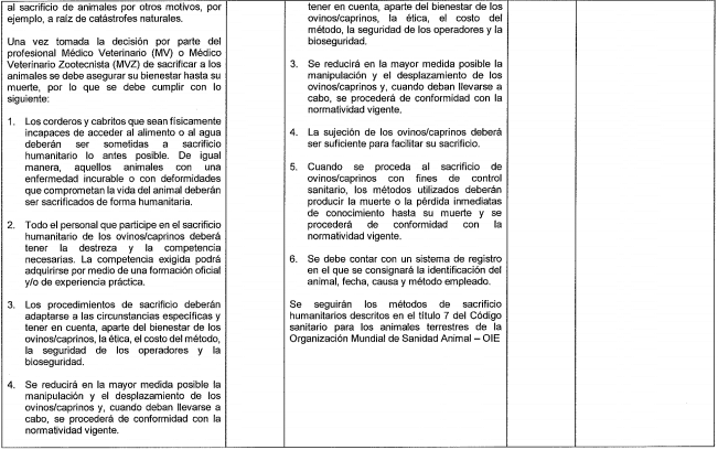 1. Los corderos y cabritos que sean físicamente incapaces de acceder al alimento o al agua deberán ser sometidas a sacrificio humanitario lo antes posible. De igual manera, aquellos animales con una enfermedad incurable o con deformidades que comprometan la vida del animal deberán ser sacrificados de forma humanitaria.