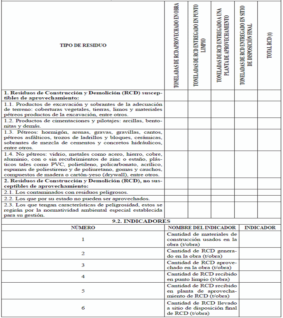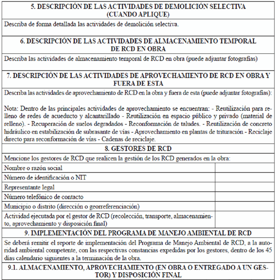 - Artículo modificado por el artículo 9 de la Resolución 1257 de 2021, 'por la cual se modifica la Resolución 0472 de 2017 sobre la gestión integral de Residuos de Construcción y Demolición (RCD) y se adoptan otras disposiciones', publicada en el Diario Oficial No. 51.867 de 23 de noviembre de 2021. |