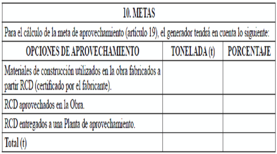 ARTÍCULO 19. METAS DE APROVECHAMIENTO DE RCD. <Artículo modificado por el artículo 9 de la Resolución 1257 de 2021. El nuevo texto es el siguiente:> Los grandes generadores deberán aprovechar efectivamente un porcentaje en peso del total de los Residuos de Construcción y Demolición (RCD) generados en la obra, conforme a la categoría del municipio donde esta se localice, según lo dispuesto en la siguiente tabla: