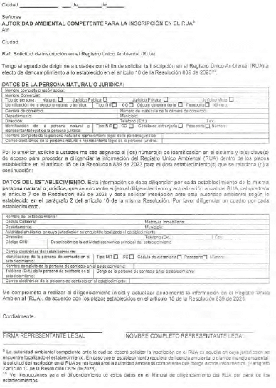 ARTÍCULO 10. SOLICITUD DE INSCRIPCIÓN EN EL REGISTRO ÚNICO AMBIENTAL (RUA). Los establecimientos sujetos al diligenciamiento y actualización anual del RUA de que trata el artículo 7o de la presente resolución, deberán solicitar la inscripción en el RUA, mediante comunicación dirigida a la autoridad ambiental competente. La solicitud de inscripción se deberá diligenciar de acuerdo con la información requerida en el Anexo 2 de la presente resolución y las instrucciones establecidas en el Manual de diligenciamiento del RUA, elaborado por el Ideam.