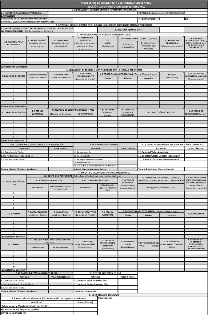 Que en ejercicio de la facultad conferida a este Ministerio de establecer lineamientos para el reporte de información, es necesario contar con el inventario histórico (1994-2013) y anual (2014 y siguientes), de las inversiones realizadas por las entidades territoriales para la conservación del recurso hídrico y para tal efecto, es procedente adoptar una serie de formatos e instructivos, para el reporte de dicha información por parte de las entidades territoriales a las autoridades ambientales y estas a su vez al Ministerio de Ambiente y Desarrollo Sostenible.