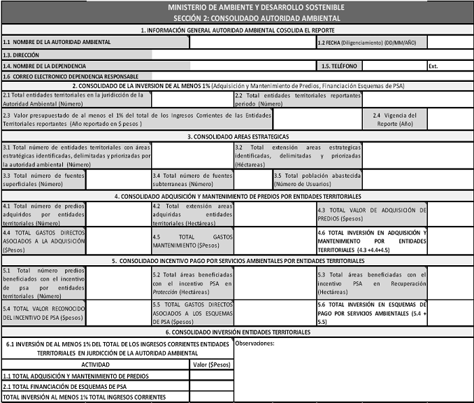 | 1.1 | NOMBRE DE LA AUTORIDAD AMBIENTAL | Indique el nombre de la Autoridad Ambiental que consolida el reporte de información |