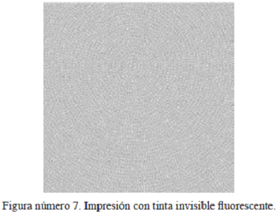 2.4.3. Impresión con tintas fugitivas al agua: tinta de seguridad que al contacto con cualquier solución acuosa se diluye disminuyendo la intensidad y definición del diseño. En particular este diseño incluye una impresión irisada a tres columnas, la cual mezcla dos colores azul y rosa. Véase Figura número 6.
