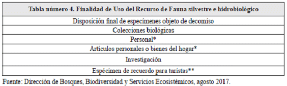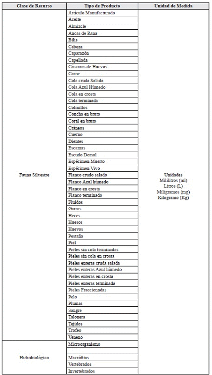 Texto original de la Resolución 1909 de 2017: Tabla 4. Clases, tipos y unidades de medida de productos de Fauna Silvestre y Recurso Hidrobiológico |