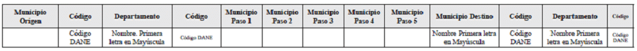 Corresponde a la ruta de transporte de los especímenes, desde el municipio origen de expedición del SUNL hasta el municipio destino del SUNL. Se incluye el código DANE.