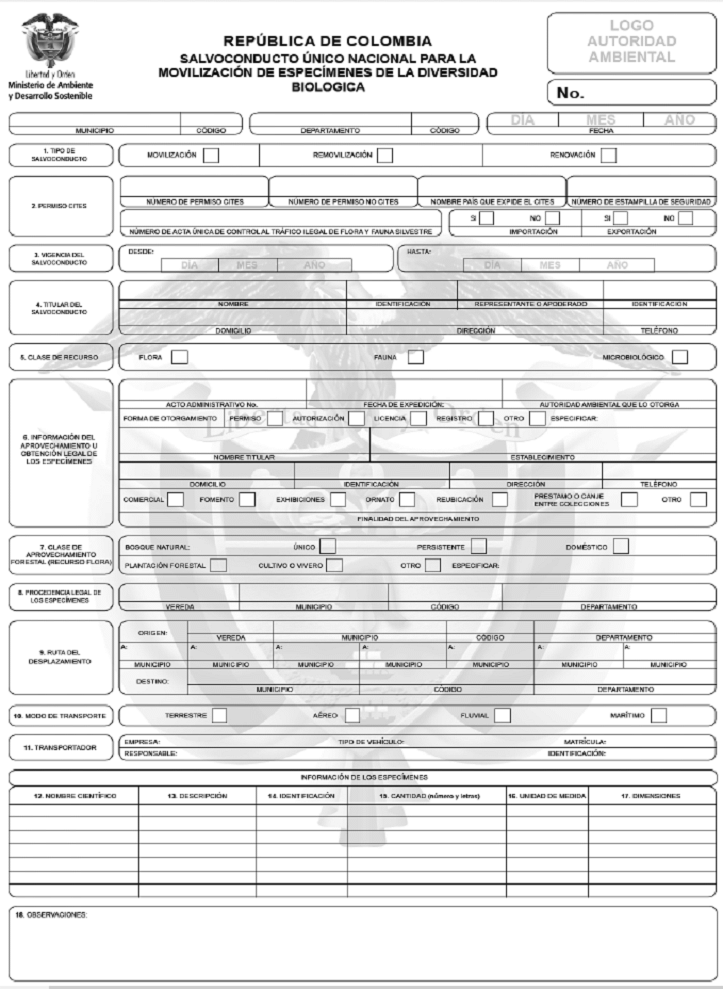 2.1. Formato: el SUNL que se establece para el transporte de especímenes de la diversidad biológica por el territorio nacional, será de conformidad con el siguiente formato: