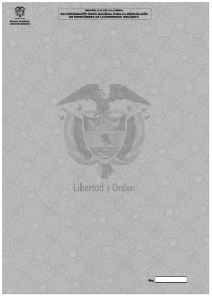 2.4.5. Impresión con tinta trirreactiva: Tinta para numeración tipográfica, la cual maneja características de seguridad de penetración, sangrado y fluorescente bajo luz ultravioleta. Este formato incluye el uso de tinta trirreactiva en la impresión de una numeración en formato alfanumérico, con el fin de facilitar el control de inventarios de la cantidad impresa para cada autoridad ambiental competente. Este número se localiza en la parte inferior derecha del formato, como se observa en la Figura número 1.