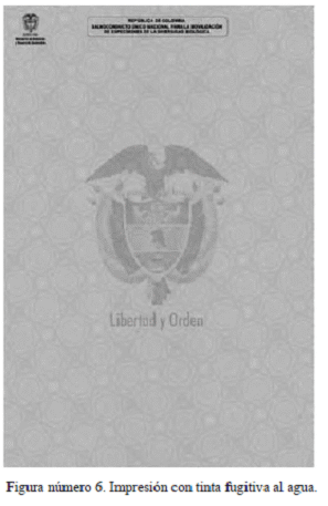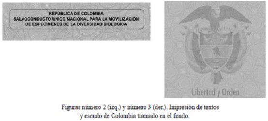 2.4.1. Impresión con tinta grasa: impresión de textos y microtextos en tinta grasa negra, localizados en la parte superior central del formato (encabezado); y escudo de la República de Colombia tramado en el fondo, localizado en el centro del formato. Véase figuras números 2 y 3.