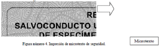 a) Microtextos de seguridad: deberán hacerse líneas de texto imperceptibles a simple vista, legibles únicamente con lupa o instrumento similar, impresas en litografía. El texto a imprimir será "MINISTERIO DE AMBIENTE Y DESARROLLO SOSTENIBLE", texto microlineal de alta concentración de letras, localizado alrededor del encabezado del documento, que aparenta formar una linea de tal forma que no se puede distinguir sin aumento. Vease figura numero 4.