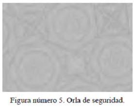 b) Orlas de seguridad: diseño de orlas de seguridad impreso en tinta grasa a manera de fondo sobre la superficie total del documento, consistente en una estructura de líneas finas perfectamente registrado formando una imagen armónica y simétrica. El propósito de las orlas de seguridad es el de hacer complicada la reproducción del documento, por cual deberá ser trabajado con variedad de elementos. Véase figura número 5.