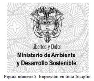 2.4.2. Impresión con tinta intaglio: tinta de seguridad que cuenta como característica principal ser sensible al tacto, de color característico al ser frotada sobre un papel, para este formato de color azul. Diseño impreso de alta definición y nitidez, con el que se imprime el escudo de la república de Colombia y el texto "Ministerio de Ambiente y Desarrollo Sostenible", localizado en la sección superior izquierda del formato. Véase Figura número 5.
