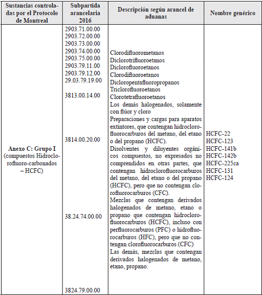 ARTÍCULO 3o. ALCANCE. Las disposiciones establecidas en la presente resolución son aplicables para las sustancias controladas y listadas en el Anexo C del Protocolo de Montreal, puras o en mezclas, y relacionadas en la siguiente Tabla.