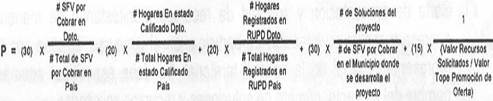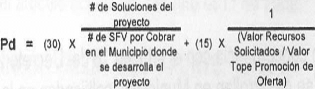 PARÁGRAFO 3o. En caso de empate en la calificación, se favorecerá al plan de vivienda que brinde mayor número de soluciones con respecto al número de subsidios por cobrar en el Municipio, sumado al menor requerimiento de recursos de promoción de oferta y Demanda, aplicando la siguiente fórmula: