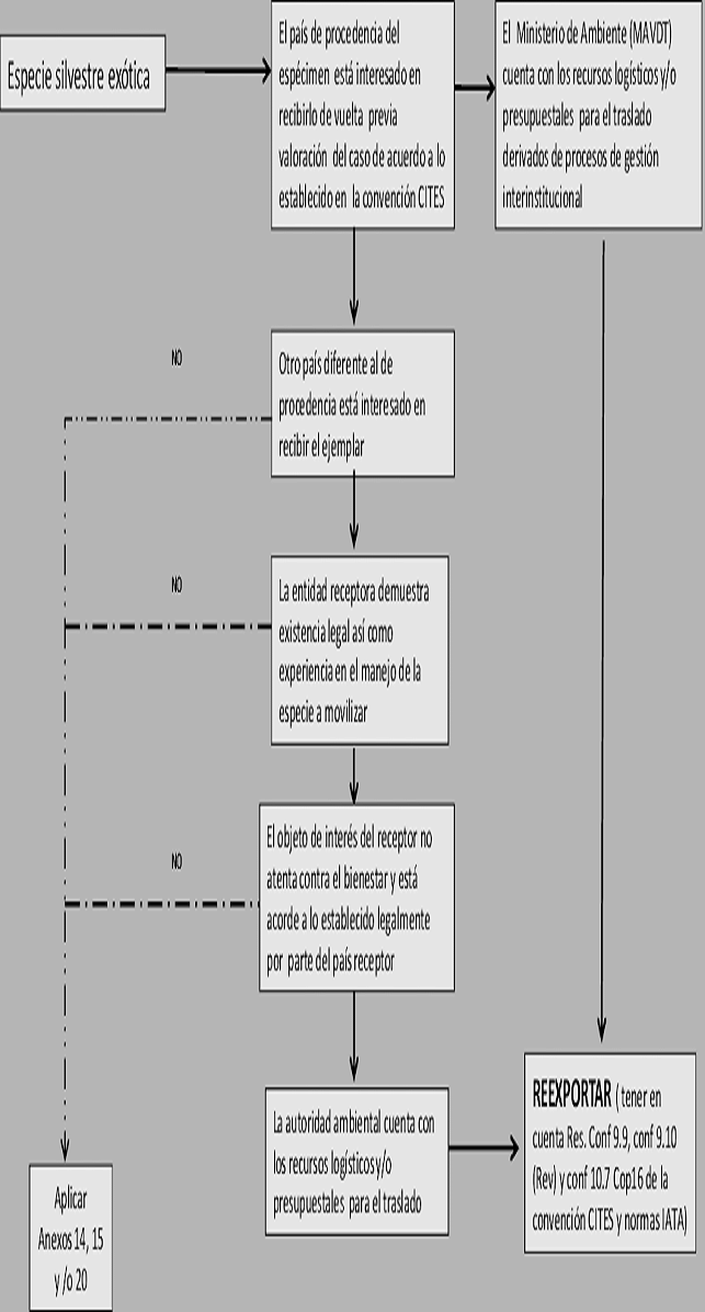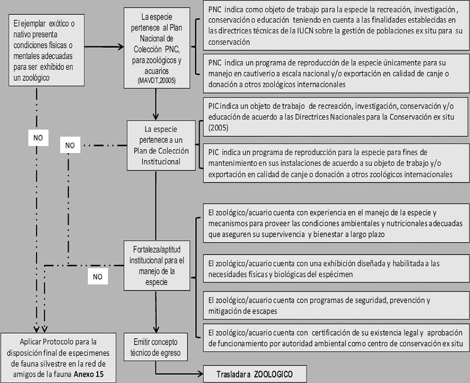 ARTÍCULO 17. DE LA DISPOSICIÓN FINAL DE FAUNA SILVESTRE EN LOS ZOOLÓGICOS. La autoridad ambiental competente podrá ordenar que aquellos especímenes que no sean objeto de liberación o de disposición en los Centros de Atención, Valoración y Rehabilitación –CAVR–, o de disposición final en zoocriaderos no comerciales con fines científicos o de repoblamiento o de subsistencia, sean entregados a los zoológicos que se encuentren legalmente establecidos, de acuerdo con lo señalado en el “Protocolo para la disposición final de especímenes de fauna silvestre en zoológicos”, indicado en el Anexo No 14 de la presente resolución.