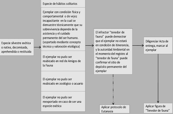 ARTÍCULO 19. DE LA DISPOSICIÓN FINAL DE ESPECÍMENES DE FAUNA SILVESTRE EN LOS TENEDORES DE FAUNA SILVESTRE. La autoridad ambiental competente podrá ordenar que aquellos especímenes que no sean objeto de liberación o de disposición en los Centros de Atención, Valoración y Rehabilitación – CAVR-, o de disposición final en zoocriaderos no comerciales con fines científicos o de repoblamiento o de subsistencia, o de disposición final en zoológicos o en miembros de la red de amigos de la fauna, sean entregados a los “Tenedores de la Fauna Silvestre” a los que hace alusión el numeral 6 del artículo 52 de la Ley 1333 de 2009. Entiéndase por “Tenedor de fauna silvestre”, a la persona natural o jurídica a quien se le ha realizado aprehensión preventiva de fauna silvestre viva nativa o exótica, sea esta terrestre o acuática y a quien por orden de la autoridad ambiental competente, previo concepto técnico y de acuerdo con la condición de excepcionalidad y demás criterios indicados en el “Protocolo para la disposición final de fauna silvestre bajo la figura de “Tenedor de fauna Silvestre” incluido como Anexo 17 en la presente resolución.