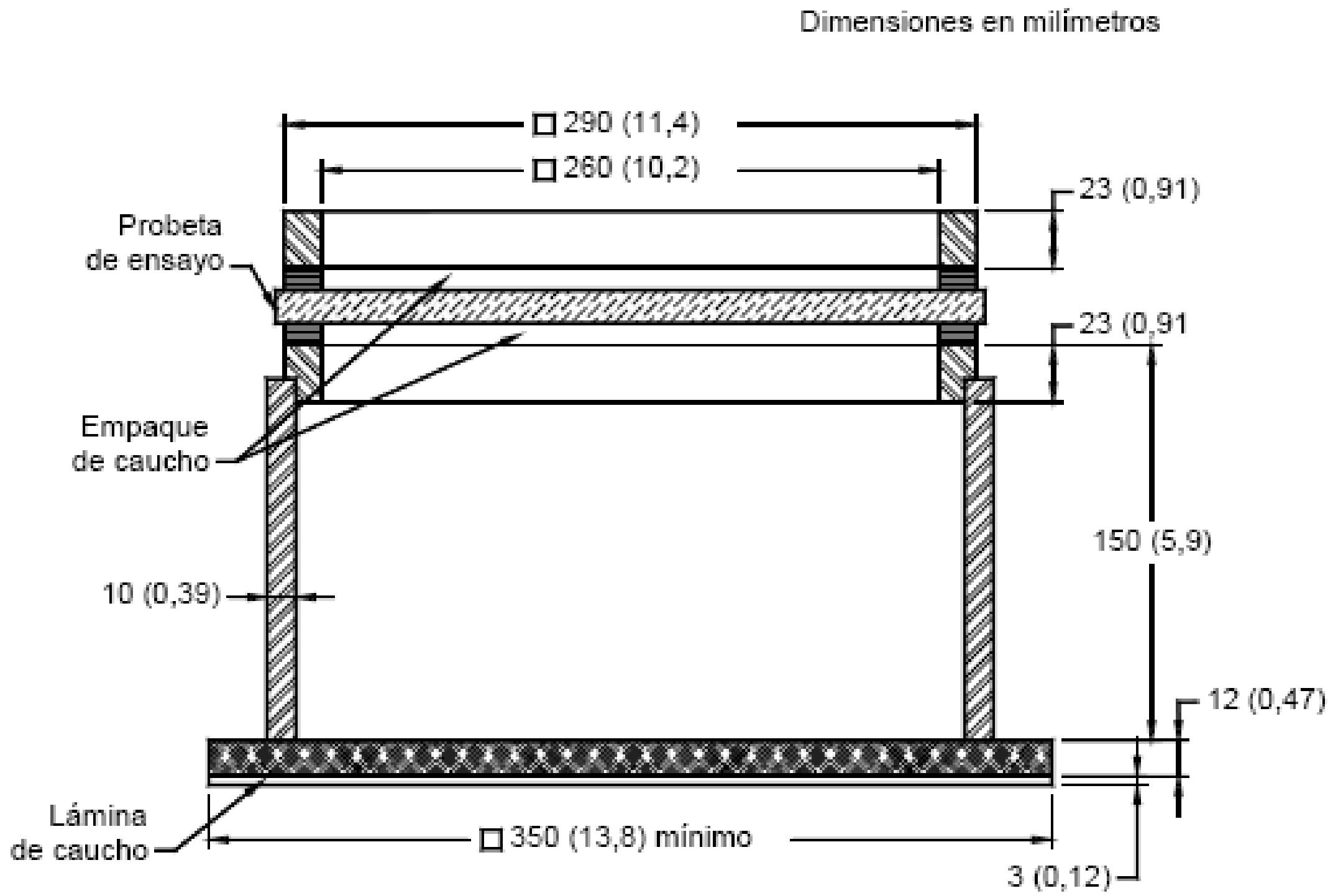 Los bordes del espécimen se apoyan en una posición horizontal, empleando un marco de acero fabricado como se ilustra en la Figura 1. La temperatura del espécimen debe estar entre -23oC y -12oC (-10oF a + 10oF). El ensayo de impacto de esfera consiste en dejar caer una esfera de acero de 2,254 a 2,282 kg (5 libras ± 0.5 oz), desde una altura de 6,10 m (20 pies) sobre el espécimen de ensayo, dentro de un área de 25 mm (1 pulgada) de su centro. Si las capas de vidrio no se rompen al primer impacto de la esfera, el espécimen se voltea y se repite el mismo ensayo en la superficie opuesta. En caso de laminados asimétricos con sólo una superficie exterior de vidrio, el espécimen debe recibir un impacto en cada superficie, empezando con la de vidrio. En caso de laminados que no tengan superficies exteriores de vidrio, el espécimen debe recibir un impacto en cada superficie. Cualquier impacto que no ocurra dentro del área de 1 pulgada del centro del ensamble, se debe descartar y realizar el ensayo en otra muestra. Se deben ensayar 2 especímenes de 305 x 305 mm (12 x 12 pulgadas).