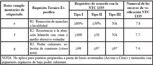 Además demostrar el cumplimiento de la totalidad de requisitos técnicos específicos para las pinturas Tipo I, II o III, con los respectivos ensayos de los numerales establecidos en la NTC 1335 del 18 de marzo de 2015, de acuerdo con la Tabla No 1.