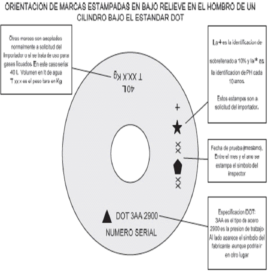 Estampe original: Marcación permanente de letras, números, símbolos u otros signos grabados originalmente por el fabricante en bajo relieve en el hombro del cilindro, que lo identifica y permite hacer su trazabilidad.