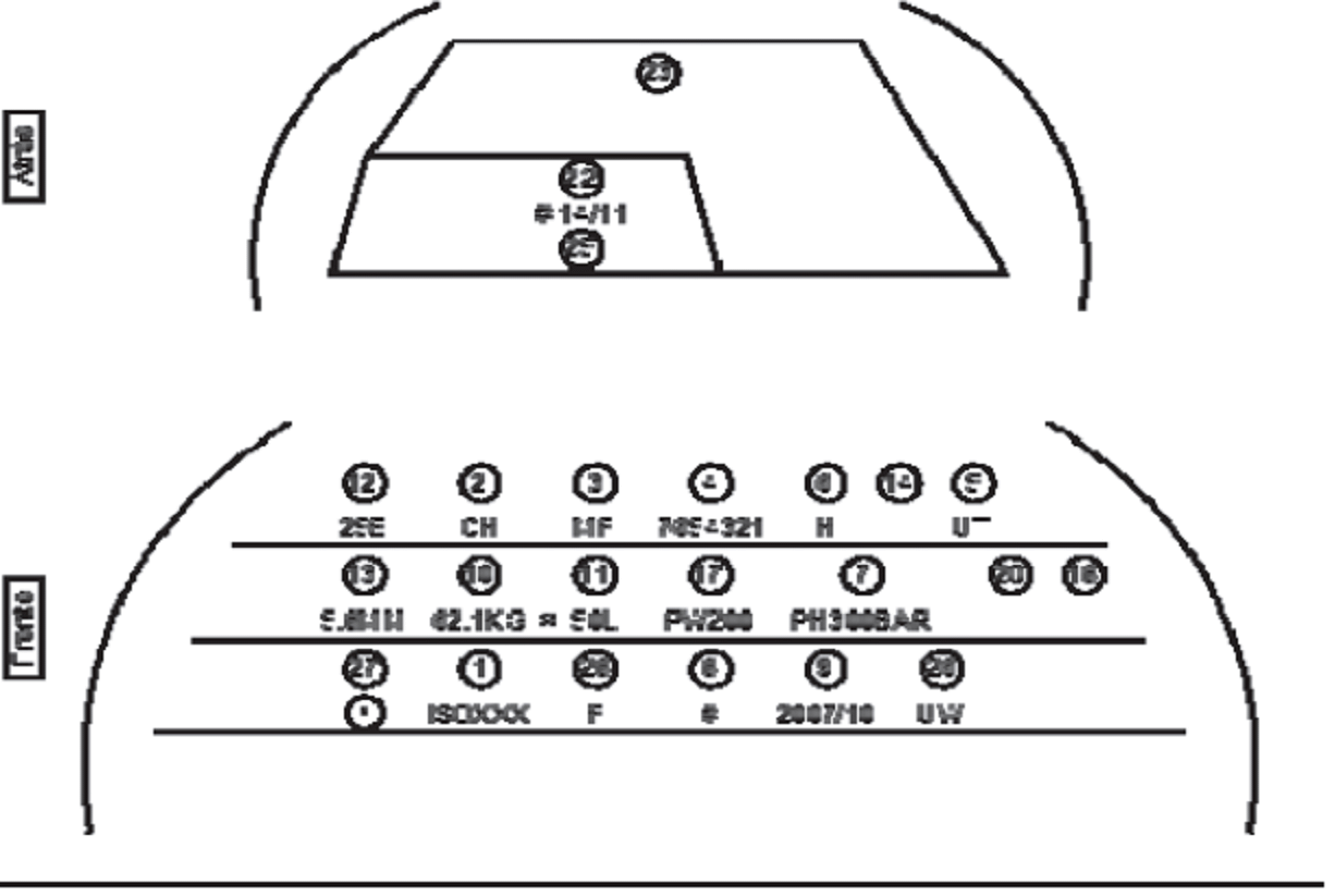 1. El grupo superior contiene marcas de fabricación y deben aparecer consecutivamente en el orden indicado en el literal (p) del 12 al 19 de esta sección.