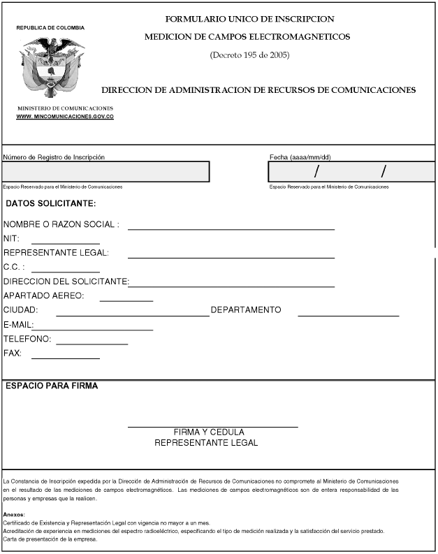 La Constancia de Inscripción expedida por la Dirección de Administración de Recursos de Comunicaciones no compromete al Ministerio de Comunicaciones en el resultado de las mediciones de campos electromagnéticos. Las mediciones de campos electromagnéticos son de entera responsabilidad de las personas y empresas que la realicen.