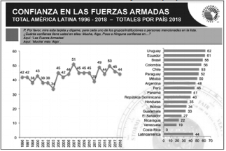 | Gráfico 1. | Confianza en las Fuerzas Armadas: total América Latina 1996 - 2018 y totales por país 2018. |