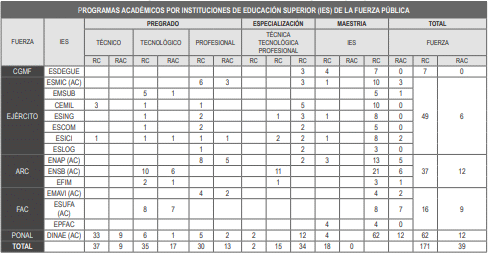 Nuestro Sistema Educativo cuenta con instituciones educativas reconocidas por el Ministerio de Educación Nacional, 6 de ellas acreditadas en alta calidad. Del mismo modo, disponemos de 170 programas de educación superior reconocidos por el MEN, de los cuales 39 tienen registro en alta calidad y 131 disfrutan de registro calificado, además se tienen más de 4.500 programas de capacitación que especializan a los uniformados en el arte militar y policial.