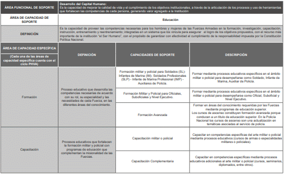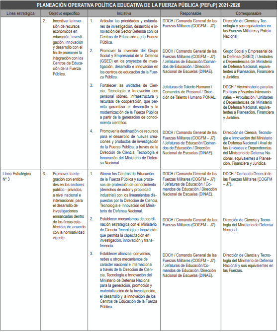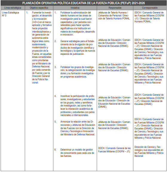 La formulación de este nuevo documento de Política de Educación de la Fuerza Pública 2021 – 2026 estuvo en poder de la Dirección de Desarrollo del Capital Humano del Ministerio de Defensa Nacional en coordinación con el Departamento de Educación y Doctrina Conjunta del Comando General de las Fuerzas Militares (J7) y las Jefaturas/Comandos y Dirección de Educación de las Fuerzas Militares y la Dirección Nacional De Escuelas de la Policía Nacional el cual se enfoca en el fortalecimiento del capital humano.