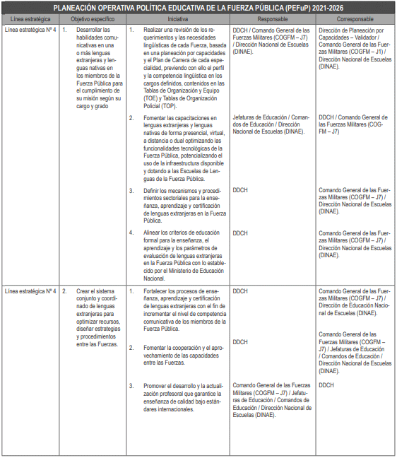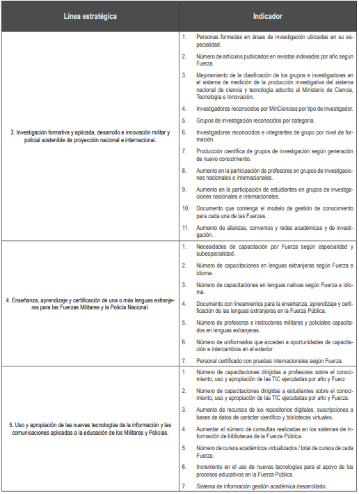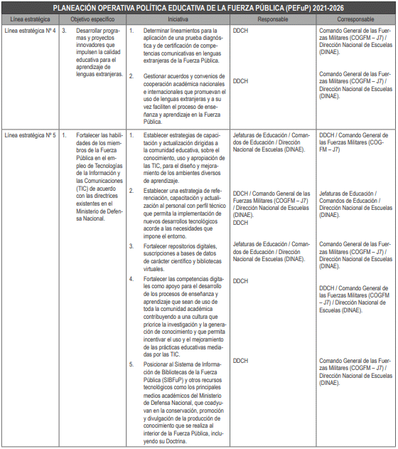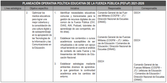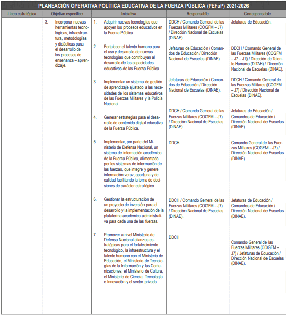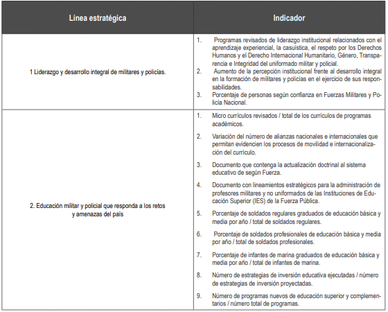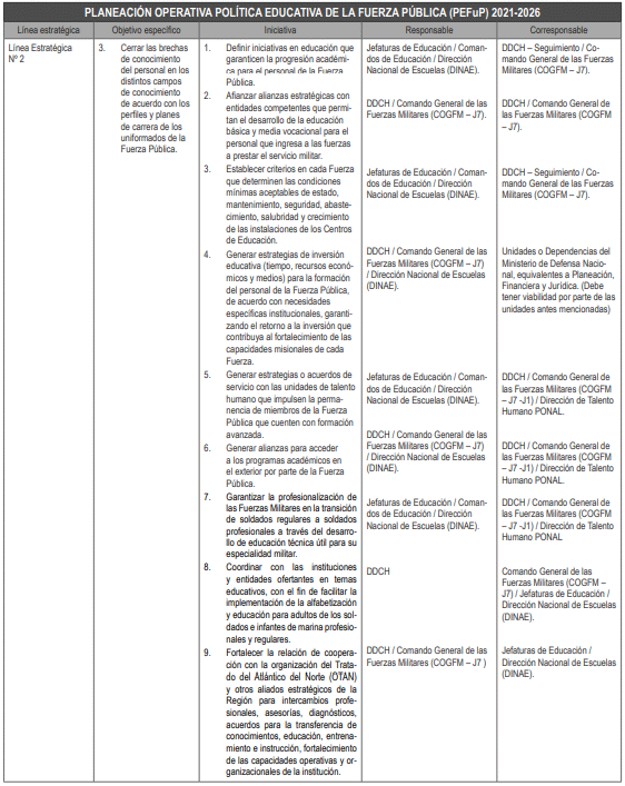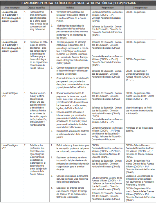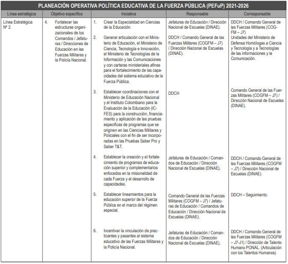 En este sentido el Ministerio de Defensa formula la Política Educativa de la Fuerza Pública 2021 – 2026, la cual busca ser formadora de hombres y mujeres de indeclinable espíritu militar o policial con un alto sentido ético, comprometidos con el cumplimiento de sus metas, que interiorizan el respeto por los Derechos Humanos y el Derecho Internacional Humanitario, y con las aptitudes físicas y cognitivas necesarias e indispensables para enfrentar cada reto que a diario presenta nuestra nación.