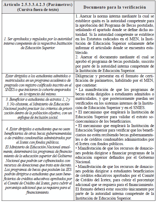 ARTÍCULO 6o. DOCUMENTOS PARA LA VERIFICACIÓN DE LOS PARÁMETROS MÍNIMOS DE LOS PROGRAMAS DE BECAS. Para verificar los parámetros que se establecen en el artículo 2.5.3.3.4.2.3 del Decreto 1075 de 2015, las Instituciones de Educación Superior deberán:
