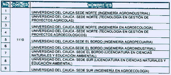 | 21 | UNIVERSIDAD DEL CAUCA - SEDE EL BORDO (LICENCIATURA EN CIENCIAS NATURALES Y EDUCACIÓN AMBIENTAL) - SEDE NORTE (TECNOLOGÍA EN GESTIÓN DE PROYECTOS AGROECOLÓGICOS) - SEDE SUR (INGENIERÍA EN AGROECOLOGÍA - INGENIERÍA AGROPECUARIA - TECNOLOGÍA EN GESTIÓN DE POYECTOS AGROECOLÓGICOS) | SUBSANAR |