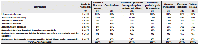 PARÁGRAFO 6. <Parágrafo adicionado por el artículo 2 de la Resolución 8652 de 2019. El nuevo texto es el siguiente:> Cuando un director rural tenga a su cargo un establecimiento educativo que sólo brinde el servicio para los niveles de preescolar y/o básica primaria, no se le aplicará el instrumento de encuestas a estudiantes, porto anterior la ponderación de tos instrumentos de evaluación será: