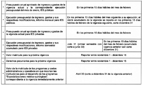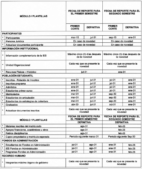 Artículo 3o. Actualización de la información en el snies por parte de las instituciones de educación superior y quienes ofrezcan y presten el servicio público de educación superior. La información debe ser actualizada en el SNIES por las Instituciones de Educación Superior y las demás entidades habilitadas legalmente para ofrecer y prestar el mencionado servicio público, dentro de las fechas que se establecen a continuación: