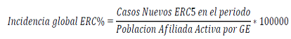 Mide: La tasa de incidencia de Enfermedad Renal Crónica estadio 5 proporciona una estimación de la evolución de la enfermedad permitiendo a su vez estimar el grado de progresión. Se espera una disminución en la aparición de nuevos casos estadio 5 en respuesta al diagnóstico y manejo oportuno y adecuado de las enfermedades precursoras.