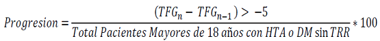 Numerador: Pacientes con enfermedades precursoras (HTA-DM) mayores de 18 años diferencia en TFG mayor a -5 reportados a la Cuenta de Alto Costo, en la misma EPS durante los dos periodos de medición.