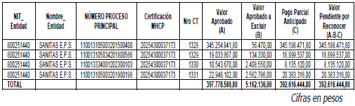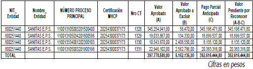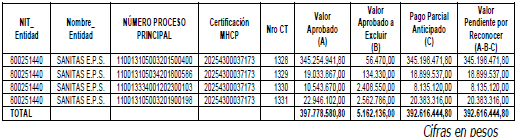 Los valores aprobados coinciden con lo estipulado en el contrato de transacción suscrito con la mencionada EPS, conforme a lo establecido en el Decreto número 521 de 2020, modificado por el Decreto número 1810 de 2020 y el Decreto número 507 de 2022.