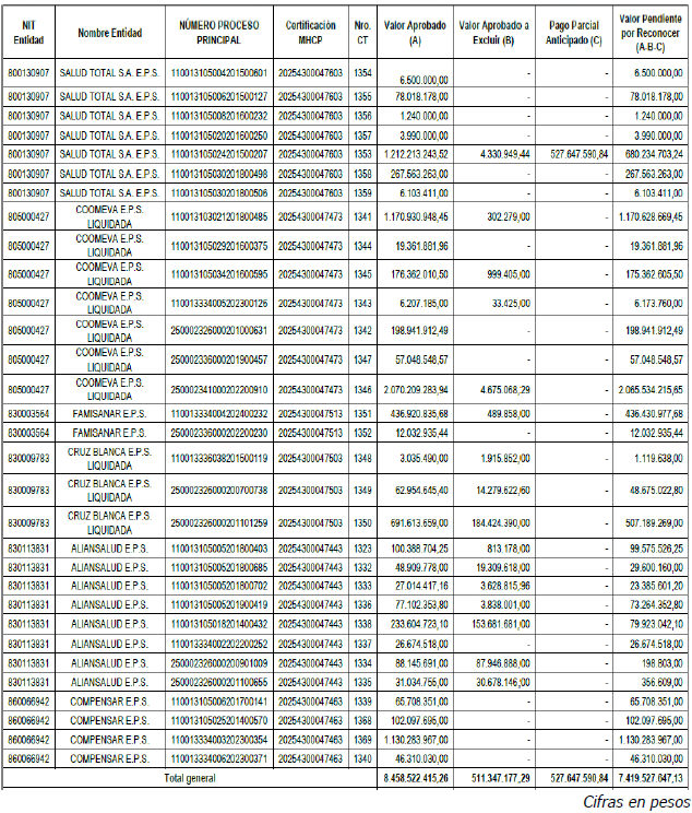Los valores aprobados coinciden con lo estipulado en el contrato de transacción suscrito con la mencionada EPS, conforme a lo establecido en el Decreto número 521 de 2020, modificado por el Decreto número 1810 de 2020 y el Decreto número 507 de 2022.